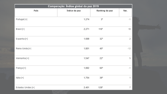 Esta é a décima terceira edição do Global Peace Index (GPI), que classifica 163 estados e territórios independentes de acordo com seu nível de tranquilidade.